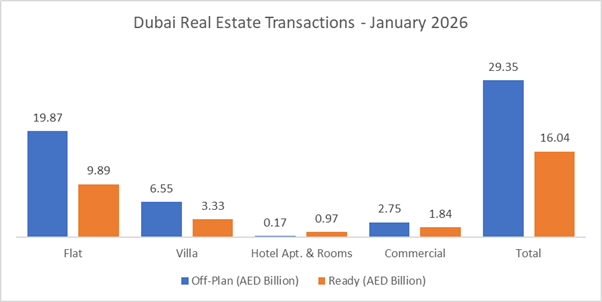 Land transactions in January 2026 was 56.4% of the total transactions value. The market activity increased by AED 50 billion over January 2025, 92% YoY.